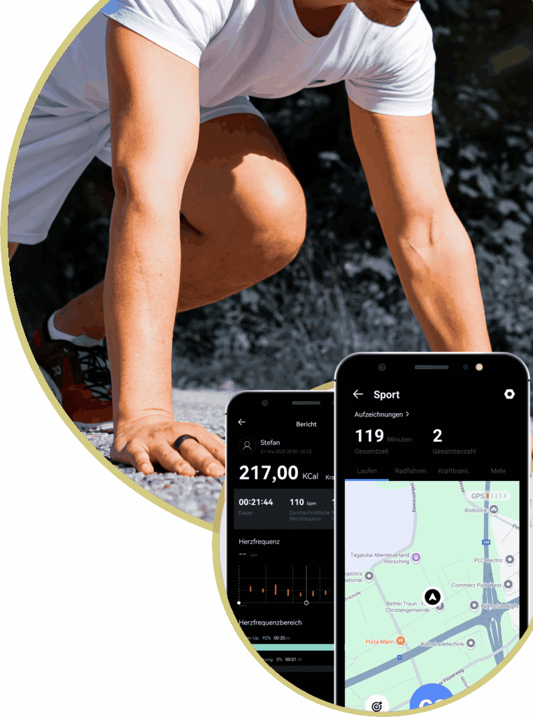 Die Sportanalyse des NEXTRING kombiniert modernste Sensorik mit intelligenter Analyse. Egal ob du dich für Laufen, Radfahren, Gehen, oder ein Workout begeisterst, der Ring zeichnet deine Bewegung, Puls, Kalorienverbrauch, Trainingsdauer und Intensität präzise auf. Bei den Sportarten Gehen, Laufen und Radfahren wird zusätzlich die Strecke via Smartphone-GPS erfasst, für eine exakte Analyse deiner Trainingsrouten und Distanzen.