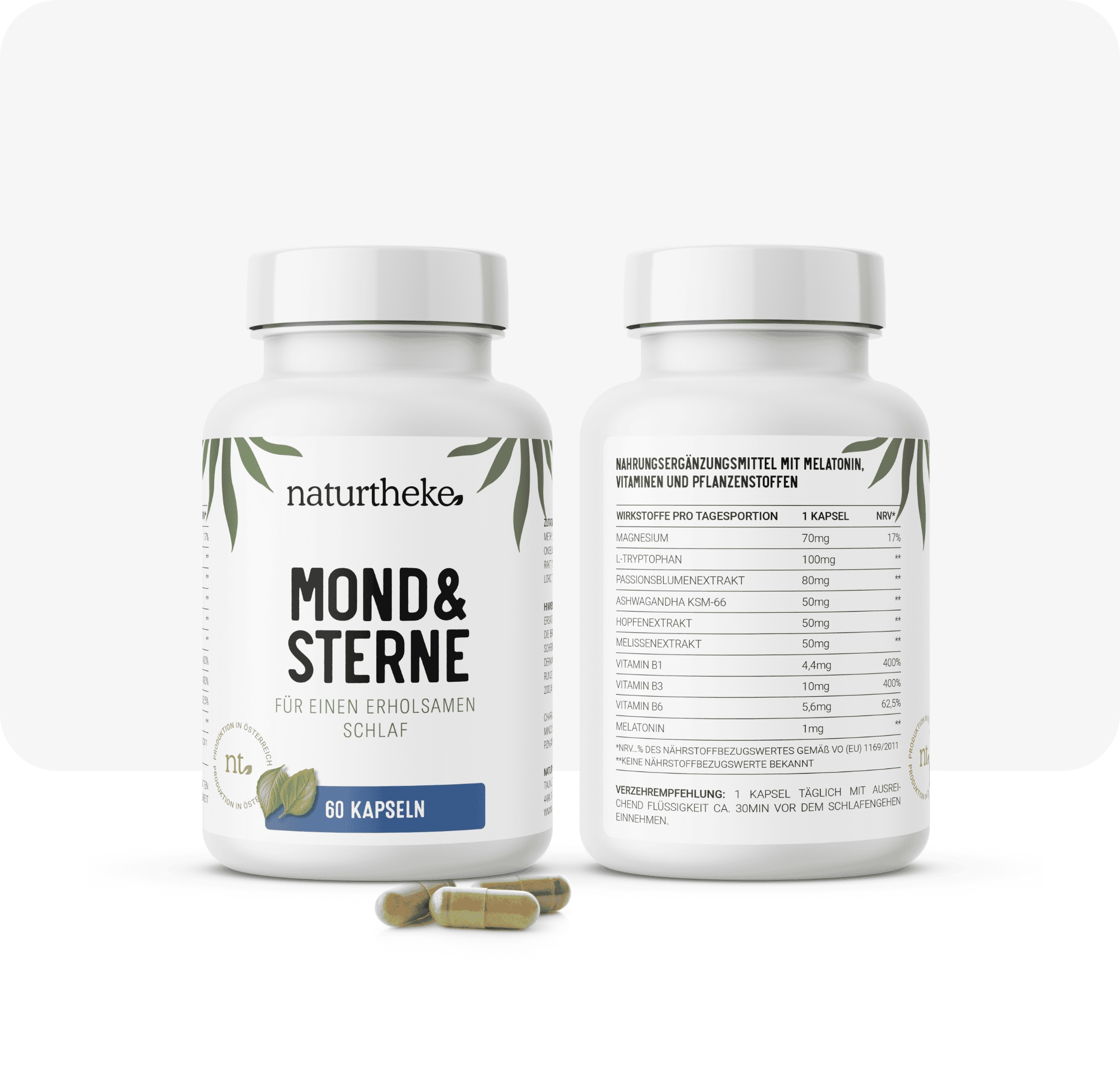 Magnesiumbisglycinat, Hydroxypropylmethylcellulose (Kapselhülle), L-Tryptophan, Passionsblumenextrakt, Ashwagandha KSM-66, Hopfenextrakt, Melissenextrakt, Niacinamid, Pyridoxinhydrochlorid, Thiaminhydrochlorid, Melatonin