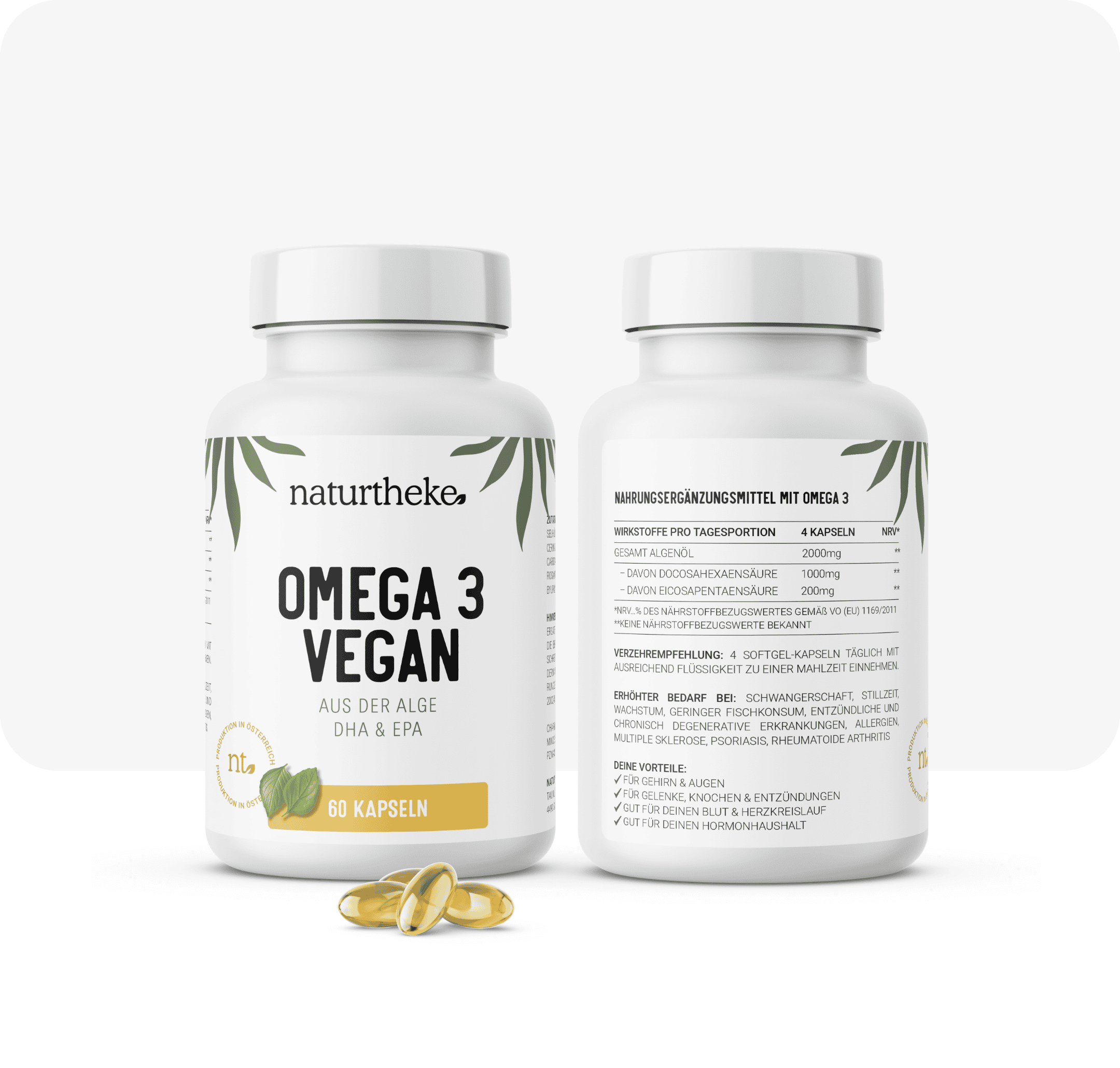 Öl aus der Mikroalge Schizochytrium sp., Kapselhülle (modifizierte Stärke, Feuchthaltemittel: Glycerin; Geliermittel: Carrageen; Stabilisator: Natriumcarbonat), MCT-Öl, Antioxidationsmittel: Extrakt aus Rosmarin, stark tocopherolhaltige Extrakte, Ascorbylpalmitat