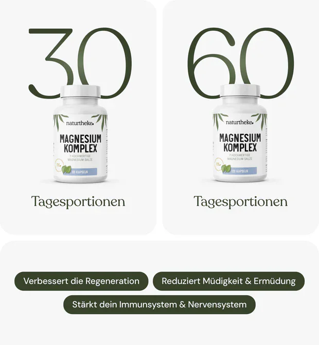 Unser Magnesium Komplex besteht aus der idealen Mischung von sieben Magnesium-Verbindungen unterschiedlicher Lösungen und Aufnahmezyklen. Eine magnesiumreiche Form in einer Kapsel. Wir erzielen mit dem Magnesium Komplex eine optimale Versorgung, egal welcher pH-Wert in deinem Magen-Darm-Bereich besteht.