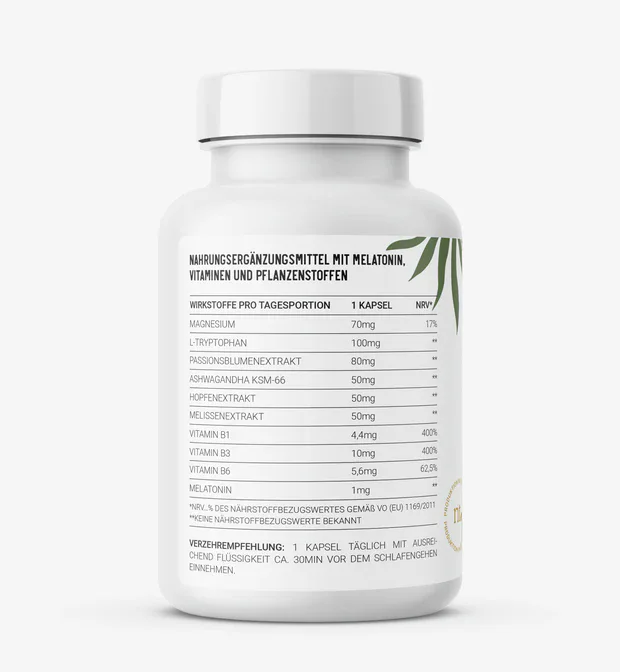 Magnesiumbisglycinat, Hydroxypropylmethylcellulose (Kapselhülle), L-Tryptophan, Passionsblumenextrakt, Ashwagandha KSM-66, Hopfenextrakt, Melissenextrakt, Niacinamid, Pyridoxinhydrochlorid, Thiaminhydrochlorid, Melatonin