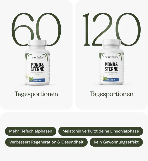 Eine perfekte Symbiose aus 10 speziellen Wirksubstanzen, die deinen Schlaf unterstützen und auf ein neues Level bringen können. Mond & Sterne hilft dir dabei, deine Einschlafzeit zu verkürzen und mehr Tiefschlafphasen zu genießen. Unser Körper nutzt diese Schlafphasen, um seine Energiespeicher aufzufüllen, und um sich zu regenerieren. Darum solltest du das Beste aus deinem Schlaf herausholen, um erholt in den Tag zu starten.