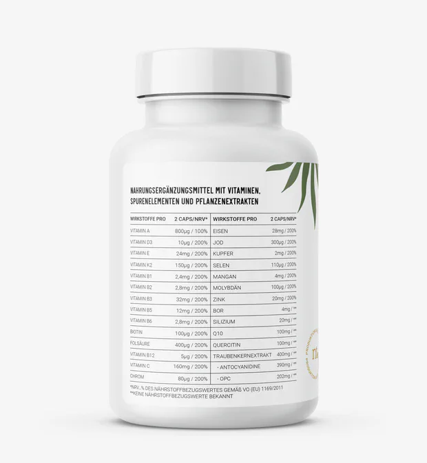 Traubenkernextrakt, Eisengluconat, L-Ascorbinsäure, Hydroxypropylmethylcellulose (Kapselhülle), Coenzym Q10, Japanischer Schnurbaumblüten extrakt, Zinkbisglycinat, Nicotinamid, Bambusextrakt, D-Alpha-Tocopherylsuccinat, Mangangluconat, Vitamin K2 Mk7, Calcium-D-Panthotenat, L-Selenmethionin, Kupferbisglycinat, Retinylacetat, Natriumtetraborat, Pyridoxinhydrochlorid, Riboflavin, Thiaminhydrochlorid, Chrompicolinat, Pteroylmonoglutaminsäure, Kaliumiodid, natriummolybdat, D-Biotin, Vitamin D3, Methylcobalamin