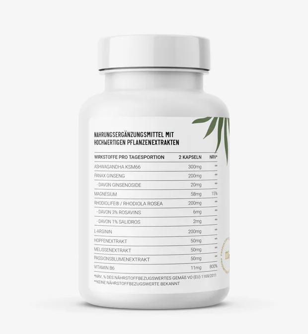 Ashwagandha KSM-66, Panax Ginseng, Magnesiumbisglycinat, Rhodiola Rosea, L-Arginin, Hopfenextrakt, Melissenextrakt, Passionsblumenextrakt, Pyridoxinhydrochlorid, Hydroxypropylmethylcellulose (Kapselhülle), Reismehl