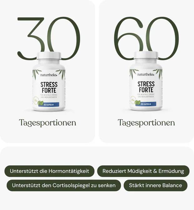 Unser Stress Forte Komplex ist der ideale Begleiter für Menschen mit einem anstrengenden Alltag, stressbedingten Erschöpfungserscheinungen oder einfach um Körper & Geist wieder in Balance zu bringen.