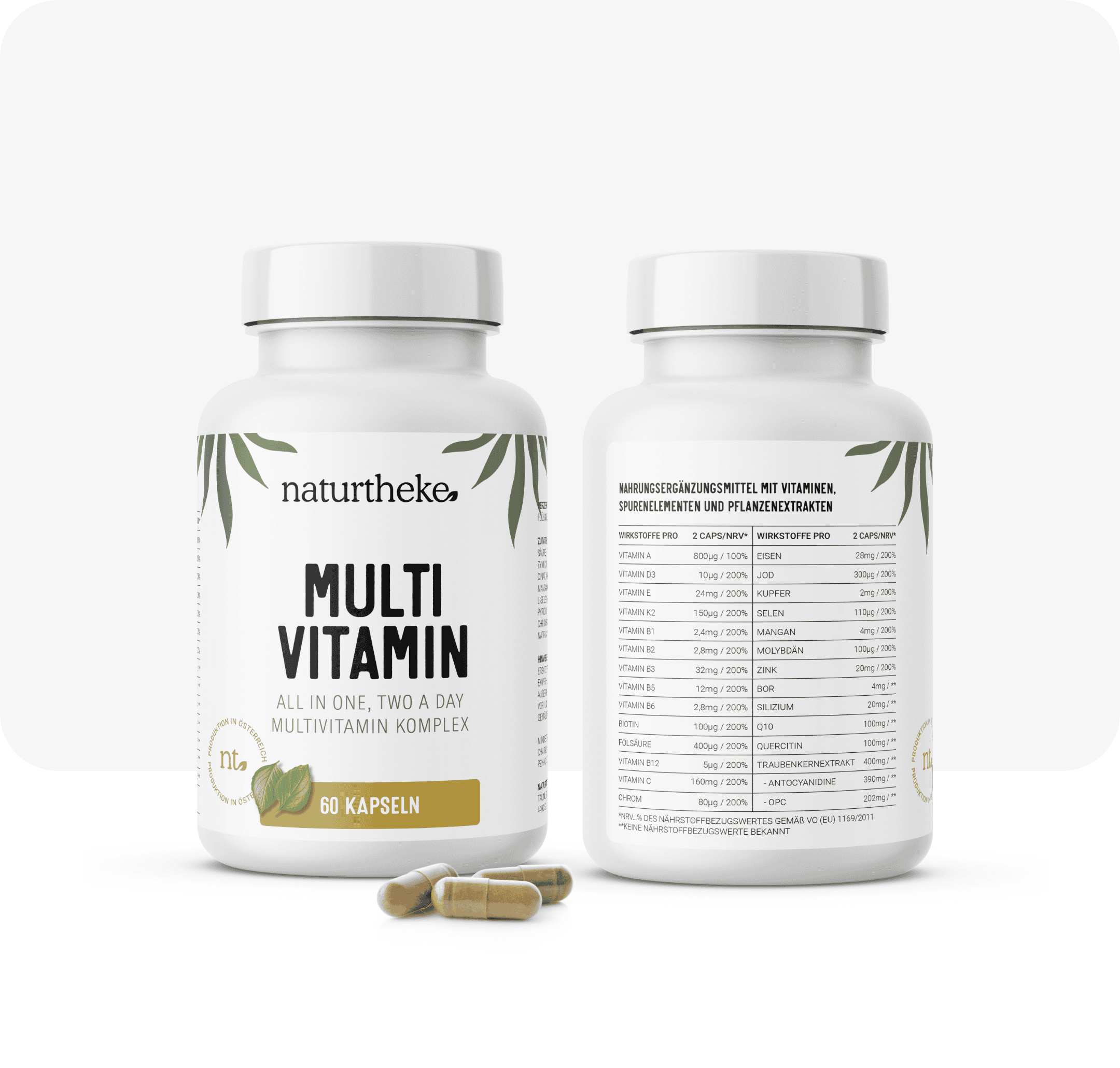 Traubenkernextrakt, Eisengluconat, L-Ascorbinsäure, Hydroxypropylmethylcellulose (Kapselhülle), Coenzym Q10, Japanischer Schnurbaumblüten extrakt, Zinkbisglycinat, Nicotinamid, Bambusextrakt, D-Alpha-Tocopherylsuccinat, Mangangluconat, Vitamin K2 Mk7, Calcium-D-Panthotenat, L-Selenmethionin, Kupferbisglycinat, Retinylacetat, Natriumtetraborat, Pyridoxinhydrochlorid, Riboflavin, Thiaminhydrochlorid, Chrompicolinat, Pteroylmonoglutaminsäure, Kaliumiodid, natriummolybdat, D-Biotin, Vitamin D3, Methylcobalamin