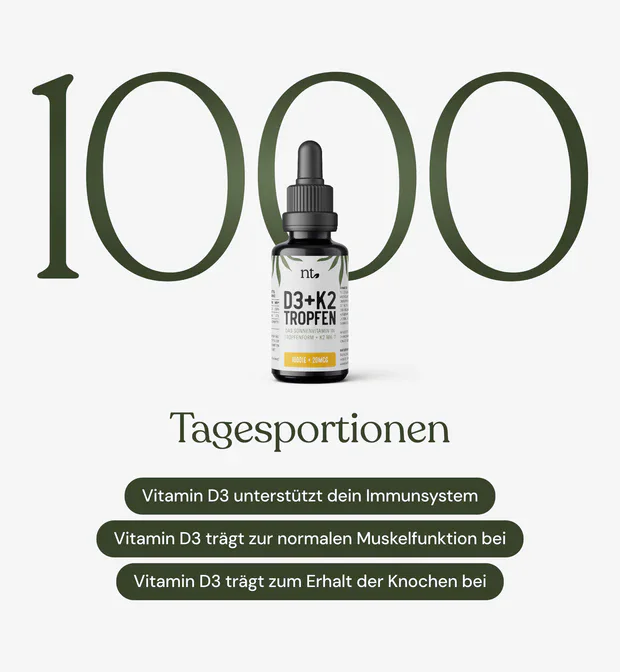 Das Sonnenvitamin D3 in Kombination mit Vitamin K2. Wir benötigen alle entsprechend viel Sonnenlicht und ausgewählte Lebensmittel (zB: fetten Fisch, Eigelb), um ausreichend mit Vitamin D3 versorgt zu sein. In unserer heutigen Zeit wird dies allerdings aufgrund diverser Umwelteinflüsse immer schwieriger. Mit unseren D3+K2 Tropfen bist du 24/7 das ganze Jahr über bestens versorgt - mit nur 1 Tropfen täglich gibst du deinem Immunsystem den nötigen Kick.